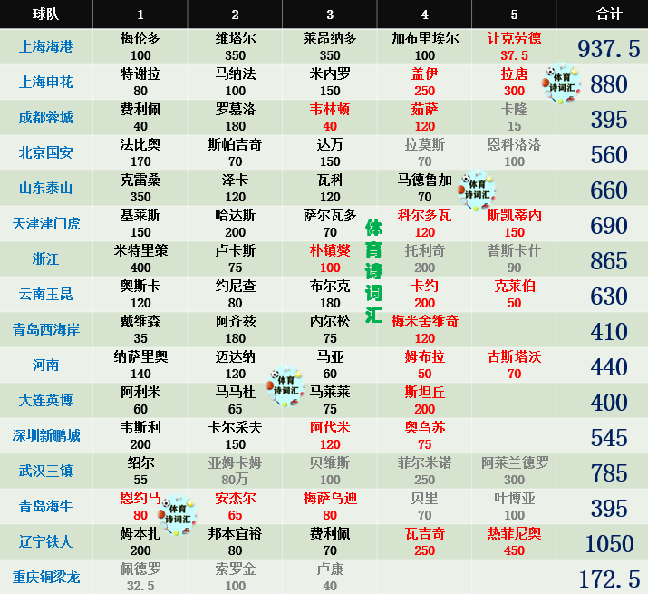 新年将至,一月将止,中超各队的外援也陆续出炉,各队外援身价如下,黑色代表留用,灰色表示待定,红色代表新援。